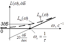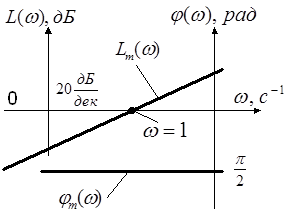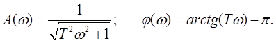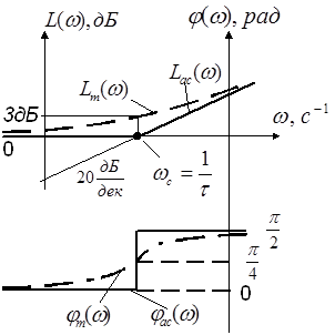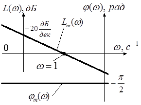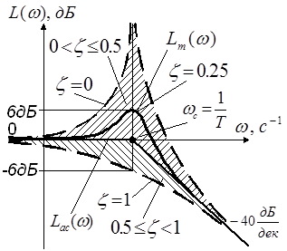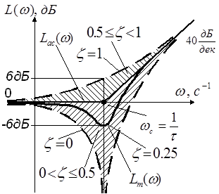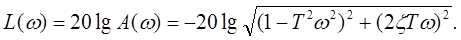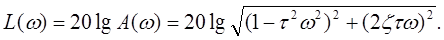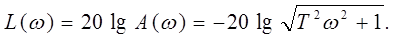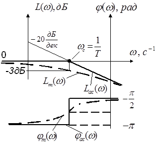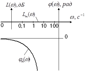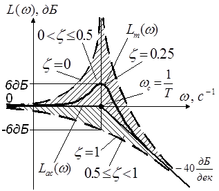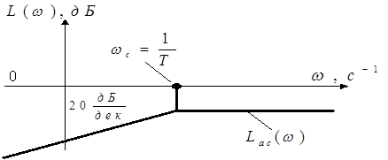 1) Tω <1 , T 2 ω 2 <<1 . При этом L ас =0 — низкочастотная асимптота (а — б). 2) Tω >1 , T 2 ω 2 >>1 . При этом L ас = –20 lgTω — высокочастотная асимптота (в — г). При изменении частот в 10 раз: ω 1 =1 c –1 ; ω 2 =10 c –1 . L ас 1 =–20lgT; L ас 2 =–20lgT–20 .