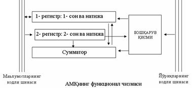 Функционал жиҳатдан АМҚ, одатда, иккита регистр, сумматор ва бошқарув схемасидан (маҳаллий бошқарув қурилмасидан) ташкил топган.