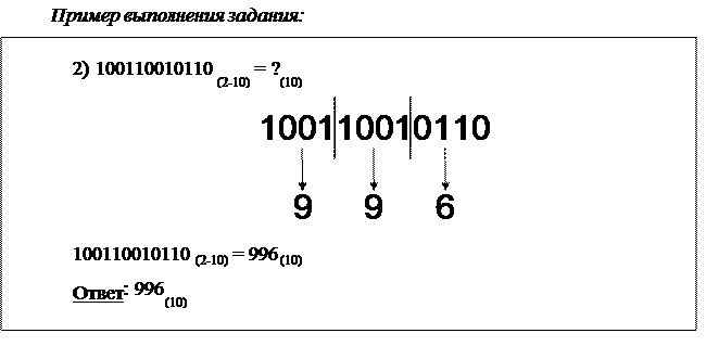 Так как в двоично-десятичном представлении каждая цифра числа кодируется по отдельности четырьмя битами, то исходное число разбиваем на группы по 4 цифры (бита) и переводим каждую такую группу в одну десятичную цифру.