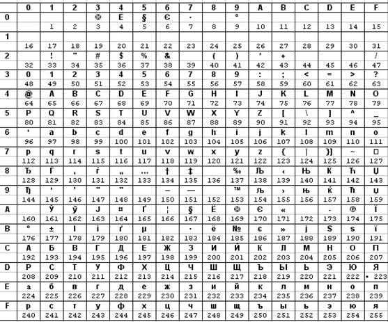 Коды строчных русских букв: 184 (ѐ), 224 (а) – 255 (я)