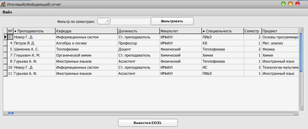 Рис.3. Запрос «Итоговый» с демонстрацией фильтра по семестрам.