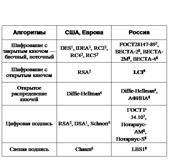 Таблица 3.Некоторые криптографические алгоритмы, разработанные и применяемые