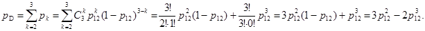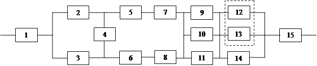 Элементы 12, 13 и 14 образуют соединение "2 из 3". Интенсивность отказов этих элементов равна. Следовательно, для определения вероятности безотказной работы можно воспользоваться комбинаторным методом: