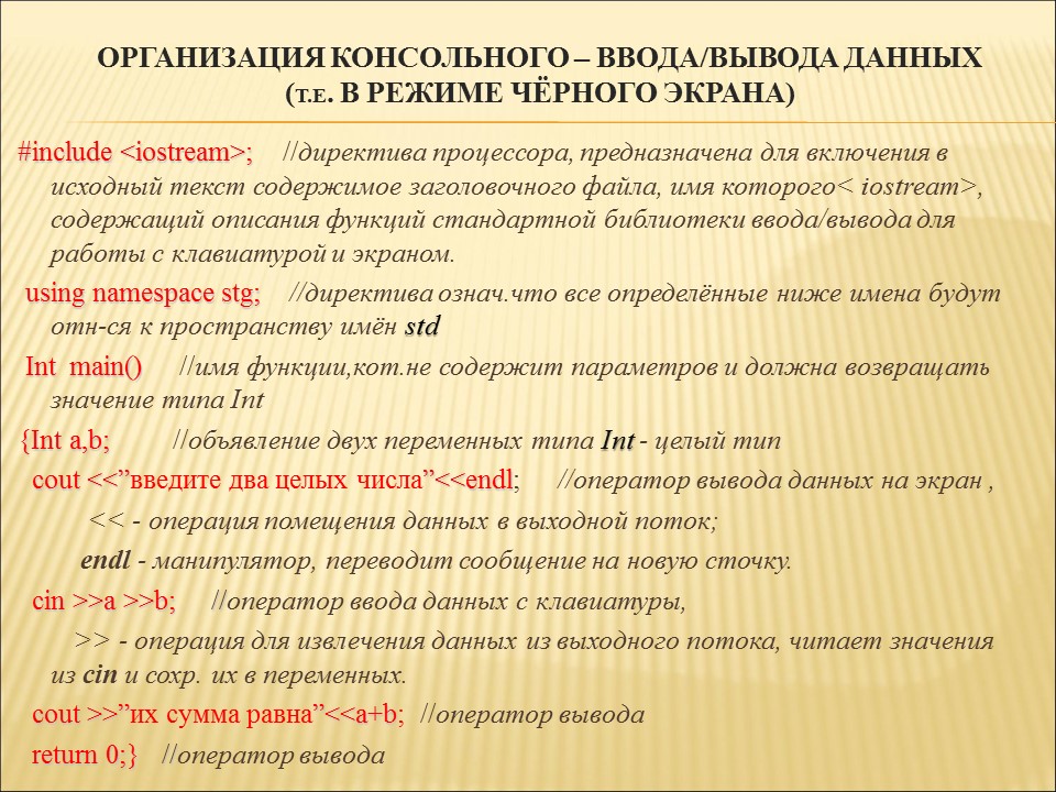 #include <iostream>; //директива процессора, предназначена для включения в исходный текст содержимое заголовочного файла, имя которого < iostream > , содержащий описания функций стандартной библиотеки ввода/вывода для работы с клавиатурой и экраном.