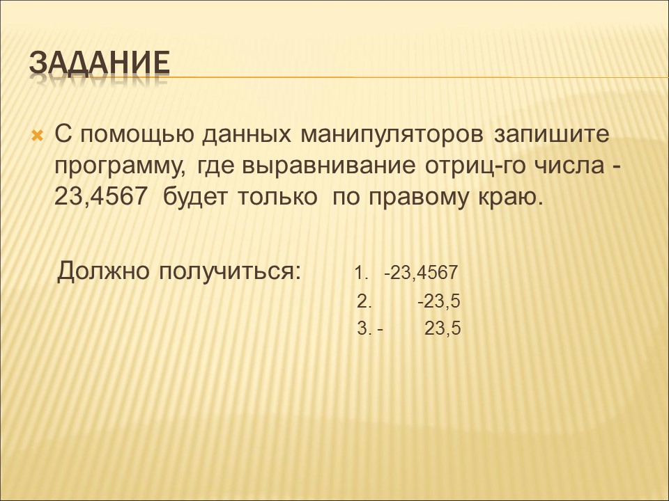 Ò С помощью данных манипуляторов запишите программу, где выравнивание отриц-го числа -23,4567 будет только по правому краю.