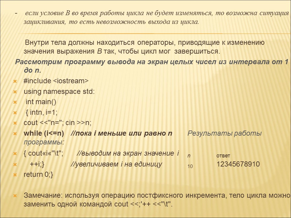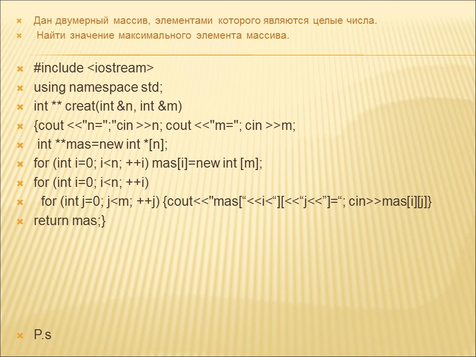 Ò cout<<" Сумма элементов главной диагонали =“<<s;