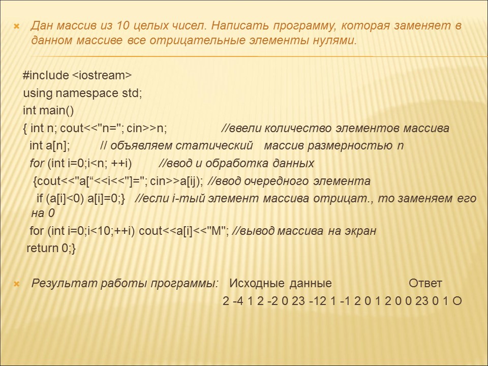 Ò for (int i=0;i<n; ++i) cout<<a[i]<<"\t"; //выводим измененный массив на экран