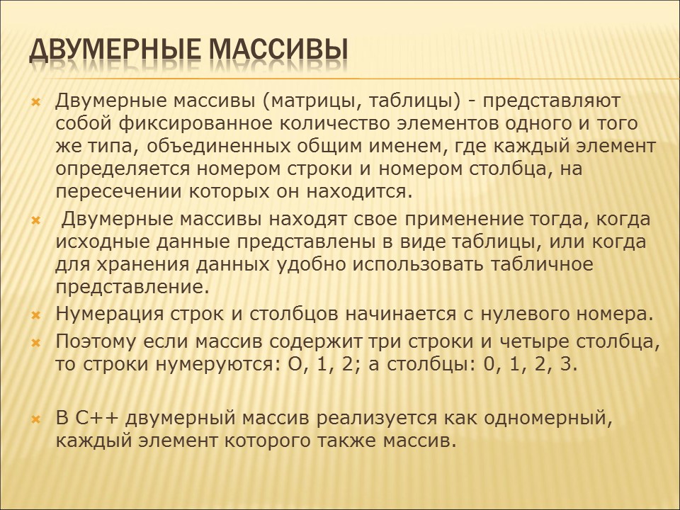 Ò Поэтому если массив содержит три строки и четыре столбца, то строки нумеруются: О, 1, 2; а столбцы: 0, 1, 2, 3.