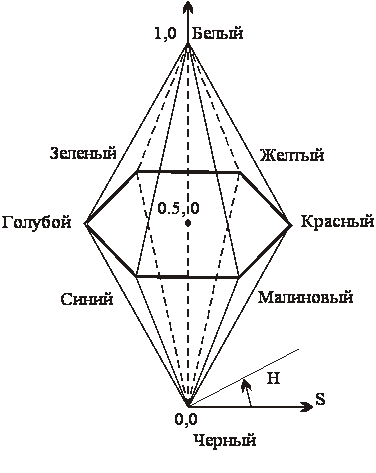 Процесс добавления белого цвета к заданному можно представить как уменьшение насыщенности S , а процесс добавления чёрного цвета – как уменьшение яркости V . Основанию шестигранного конуса соответствует проекция RGB куба вдоль его главной диагонали.