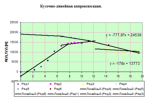 Модельная задача №3. Кусочо-нелинейная аппроксимация исходных функций R ( V ) (не менее 3 участков) и T ( V ) на всём участке. Подобрать оптимальный вариант аппроксимирующих функций с учётом неразрывности функции на границах участков.