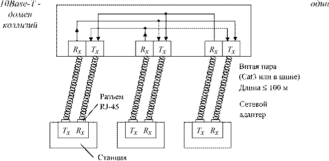 Пример протокола физического уровня – спецификация 10Base-T – неэкранированная витая пара категории 3 (Rволновое=100 Ом, RJ-45), максимальная длина физического сегмента – 100 м, манчестерский код для представления данных в кабеле.