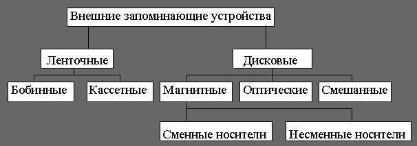 Устройства внешней памяти или, иначе, внешние запоминающие устройства весьма разнообразны. Их можно классифицировать по целому ряду признаков: по виду носителя, типу конструкции, по принципу записи и считывания информации, методу доступа и т.д.