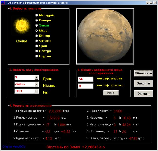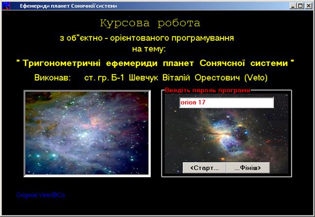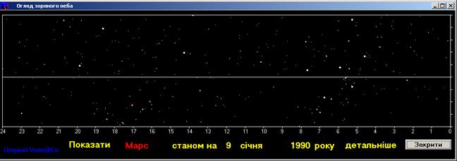 Програма явно “сира” – що називається “demo-версія”. Середовище Delphi дозволило спростити зовнішній інтерфейс програми, ввід-вивід інформації. Введення графічних компонент дозволило наочно зобразити розміщення планет на фоні зоряного неба.