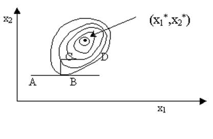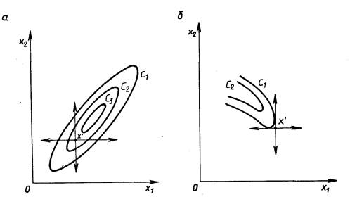 Недостаток метода прямого поиска состоит в том, что в случае сильно вытянутых, изогнутых или обладающих острыми углами линий уровня целевой функции он может оказаться неспособным обеспечить продвижение к точке минимума. Действительно, в случаях, изображенных на рисунке 2, а и б, каким бы малым ни брать шаг в направлении х1 или x2 из точки х’ нельзя получить уменьшения значения целевой функции.