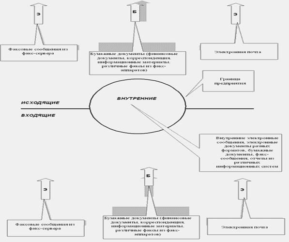 Естественно, электронные документы не существуют сами по себе, придумано множество технологий, программных продуктов, которые позволяют организовывать документы и работать с ними более эффективно. Для того, чтобы эффективно управлять документами, надо знать об источниках их происхождения. Исходя из схемы, существует множество источников и типов документов. Главная задача работы с документами - это перехват, регистрация и сохранение всех документов (или учетной информации по ним), связанных с жизнедеятельностью предприятия таким образом, чтобы мы могли быстро потом его найти в соответствии с правами доступа. Поэтому, вырисовывается следующие основные задачи при организации работы с документами