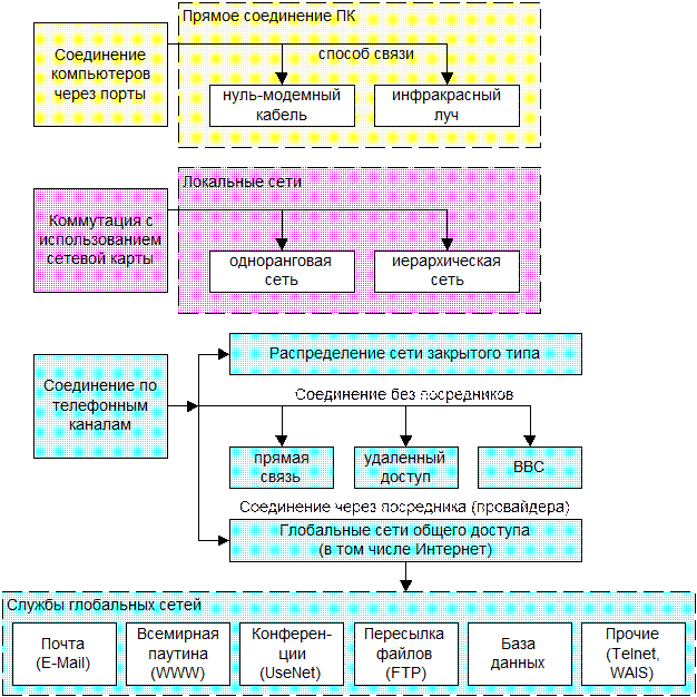 На рисунке 1, рассмотрим способы коммутации компьютеров и виды сетей.