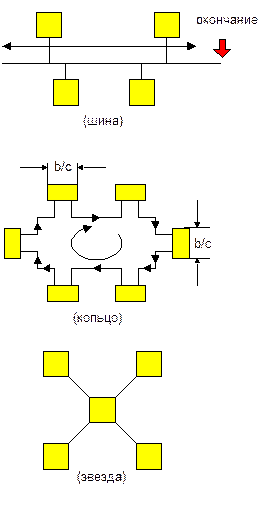 Структура типа «шина», рисунок 2(а), проще и экономичнее, так как для нее не требуется дополнительное устройство и расходуется меньше кабеля. Но она очень чувствительна к неисправностям кабельной системы. Если кабель поврежден хотя бы в одном месте, то возникают проблемы для всей сети. Место неисправности трудно обнаружить.
