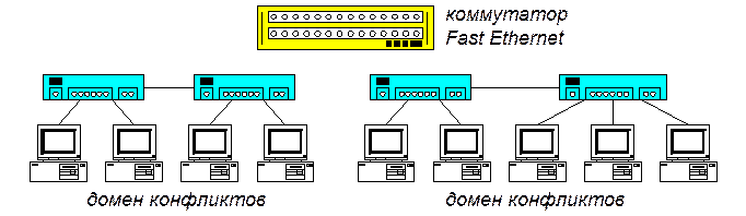 В сети Fast Ethernet организуются несколько доменов конфликтов, но с обязательным учетом класса повторителя, используемого в доменах.