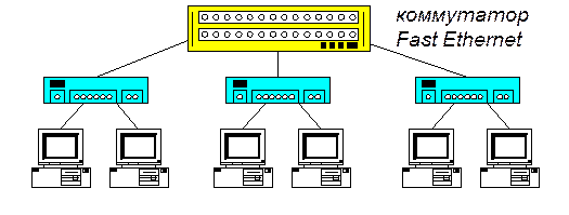 Способ соединения компьютеров называется структурой или топологией сети. Сети Ethernet могут иметь топологию «шина» и «звезда». В первом случае все компьютеры подключены к одному общему кабелю (шине), во втором - имеется специальное центральное устройство (хаб), от которого идут «лучи» к каждому компьютеру, т.е. каждый компьютер подключен к своему кабелю.