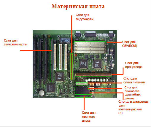 Материнская (системная, главная) плата является центральной частью любого компьютера. На материнской плате размещаются в общем случае центральный процессор, сопроцессор, контроллеры, обеспечивающие связь центрального процессора с периферийными устройствами, оперативная память, кэш-память, элемент ROM-BIOS, аккумуляторная батарея, кварцевый генератор тактовой частоты и слоты для подключения других устройств.