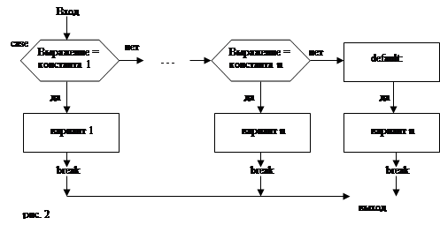 В операторе switch вычисляется целое выражение в скобках ( его называют селектором), и его значение сравнивается со всеми константами. При совпадении выполняется соответствующий вариант (одна или несколько инструкций). Все константы в записи оператора должны быть различными. Вариант с ключевым словом default (прочие) реализуется, если ни один другой не подошел (если слово default отсутствует, а все результаты сравнения отрицательны, то ни один вариант не выполняется. Для прекращения последующих проверок после успешного выбора некоторого варианта используется оператор break, обеспечивающий немедленный выход из оператора switch.