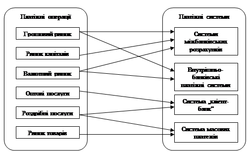 Рис.1. Взаємозв'язок між характером платіжних операцій та типом платіжних систем