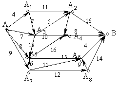 Иллюстрацией к сказанному выше может служить задача о выборе кратчайшего пути для перехода из точки A в точку B, если маршрут должен пройти через некоторые пункты. На рис. 2 эти пункты обозначены кружками, а соединяющие их дороги — отрезками, рядом с которыми проставлены соответствующие расстояния.