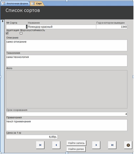 Выбрав пункт меню «Список сортов» отроется форма для ввода информации о сорте.