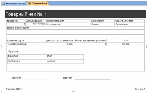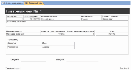 После чего откроется отчет «Товарный чек №», который можно распечатать .