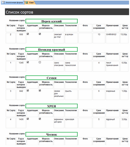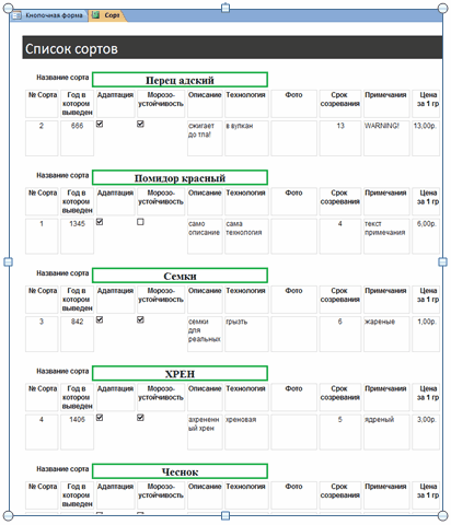 При нажатии на кнопку «Список сортов» откроется каталог предлагаемых сортов, который можно распечатать для предоставления клиенту.