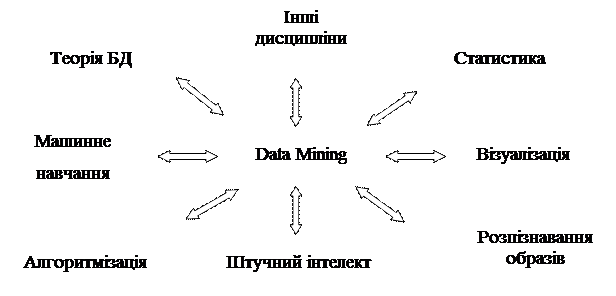 Data Mining тісно пов’язана з різними дисциплінами , що засновані на інформаційних технологіях та математичних методах обробки інформаціі (рисунок 1.1).