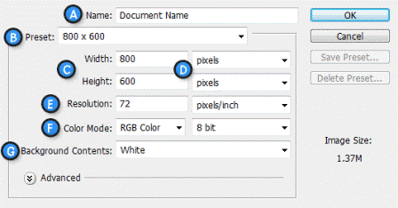 A. Имя документа - Здесь укажите имя документа (по выбору) B. Предустановки -Выберите размер документа из ранее установленных C. Размеры документа - Здесь укажите ширину и высоту документа D. Единицы измерения документа - Укажите единицы измерения документа. Для любой типичной работы для веба или на мониторе выбирайте пиксели. E. Разрешение - Укажите разрешение документа. Разрешение обычно означает число точек (или пикселей) на дюйм. При печати вам лучше поставить значение повыше (300 или выше), что также увеличит и размер документа. Тем не менее, для экранной работы или работы в вебе, подходящее разрешение 72. F. Цветовой режим - Укажите цветовой режим документа. Если только вы не собираетесь делать специальную печать, вам лучше всего работать в режиме RGB Color (Red/Green/Blue). G. Содержание Фона - Укажите тип фона вашего документа. Диалоговое окно, показанное выше, создаст документ размером 800х600 пикселей с белым фоном. Имя документа будет "Document Name", а разрешение будет наиболее подходящим для экранной работы. Сохранение и закрытие документа Photoshop Чтобы сохранить документ Photoshop, нажмите File > Save из Горизонтального меню. Во время сохранения, убедитесь, что ввели имя документа, которое позже узнаете и также выберите формат "Photoshop (*.PSD)" . Выбор этого формата обеспечит сохранение у документа всех атрибутов Photoshop, а также информацию о слоях, так чтобы вы смогли потом работать с ним.Обратите внимание, что файлы формата PSD не совместимы с веб браузерами и другими приложениями, и для таких целей вам придется сохранять файлы в другом формате. Это мы опишем в других уроках. Чтобы закрыть документ, нажмите File > Close из Горизонтального меню. Чтобы закрыть все открытые документы, нажмите File > Close All.