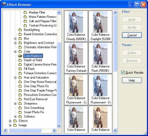 Corel Paint Shop Pro содержит большое количество эффектов, собранных воедино в специальном браузере. В левой панели в виде древовидной структуры представлены все доступные в редакторе фильтры. Вызов любого элемента открывает панель миниатюр, на которых отображаются различные варианты применения текущего фильтра. Вы не можете менять какие-либо параметры функций, однако наглядность отображения эскизов позволяет быстро выбрать приемлемый набор установок.