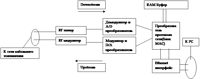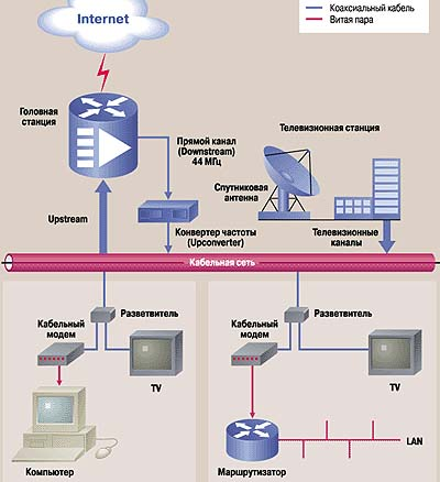 Для организации доступа в интернет посредством существующих сетей кабельного телевидения необходимы специальные устройства – кабельные модемы. Кабельные модемы располагаются на отводе кабельной магистрали и выполняют функции различных устройств: модема, шифратора-дешифратора информации, маршрутизатора, сетевого адаптера, SNMP-агента и даже концентратора Ethernet. Однако такое устройство все равно остается модемом, поскольку, прежде всего оно модулирует и демодулирует сигналы.