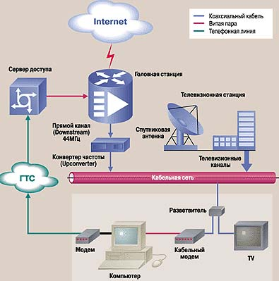Идея использования существующих линий связи для передачи цифровых сигналов не нова. Именно так работает обычный модем, который передает информацию по телефонной линии. Но возможности такой связи ограниченны, и это заставляет провайдеров Internet искать новые пути к домам своих клиентов. Если посмотреть, сколько кабелей подходит к каждой отдельной квартире, то можно заметить, что их обычно три: силовой (220 В), телефонный и телевизионный. Силовую сеть использовать трудно (хотя в этой области есть уже определённые наработки). Возможности телефонной линии постепенно исчерпываются. Остается телевизионный кабель. Но как его использовать?