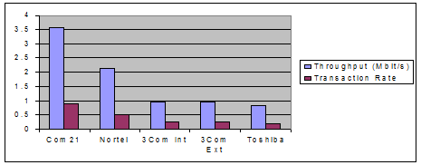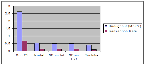 Другим конкурентом технологии CATV является технология ADSL. ADSL обеспечивает скорости передачи данных до 8 Мбит/с по направлению к пользователю(downstream) и до 1 Мбит/с в обратном направлении(upstream). Конкретные значения скоростей передачи данных сильно зависят от расстояния между пользователем и телефонной станцией. Полоса пропускания 8 Мбит/с обеспечивается пользователям, находящимся на расстоянии до 2,7 км от телефонной станции; расстояниям 2,7-3,5 км соответствует предел в 6 Мбит/с; если же пользователь удален от телефонной станции на 3,5-5,5 км, он должен довольствоваться скоростью в 1,5 Мбит/с. На расстоянии свыше 5,5 км связь по ADSL не гарантируется. Не так давно московская компания Plus Communications провела испытания оборудования для ADSL от фирмы 3Com. На физической линии длиной 4 км была зафиксирована скорость 2 Мбит/с по направлению от провайдера к клиенту и 1 Мбит/с - в противоположном направлении.
