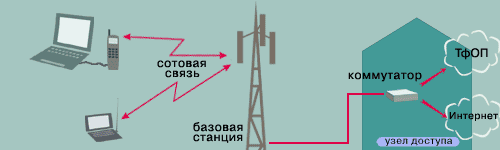 Доступ в сеть Интернет может быть организован посредством существующей системы сотовой связи с использованием аналоговых модемов (модемов для передачи по телефонным каналам) (рисунок 2). Так как каналы сотовой связи имеют достаточно узкую полосу частот, скорость передачи данных будет невелика (в процессе постепенного развития систем сотовой связи и усовершенствования технологий скорость передачи данных также постепенно росла от 9,6 Кбит/с до 19,2 Кбит/с). Определенного увеличения скорости передачи данных можно достичь за счет использования временно свободных каналов (по которым не ведутся телефонные разговоры).