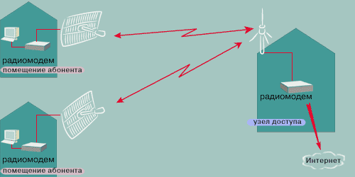 В условиях недостатка частотного ресурса были созданы, успешно применяются и развиваются беспроводные системы фиксированного доступа, работающие в инфракрасной области (на основе ИК светодиодов и полупроводниковых лазеров). Они обеспечивают рабочую дальность от 300 м до 1-3 км при скорости передачи до 155 Мбит/с. Все основные недостатки этих систем (сравнительно высокая стоимость и некоторая зависимость от погодных условий и загрязнения оптики) с лихвой окупаются отсутствием необходимости получения разрешения на использование радиочастоты, а также быстротой и простотой монтажа. На следующим этапом развития систем фиксированного радиодоступа явилось создание таких протоколов обмена информацией между приемо-передатчиками, которые позволили организовать подключение многих объектов к одному (соединение "точка-многоточка"), что наиболее соответствует задачам организации доступа в Интернет (рисунок 3). Кроме того, были созданы различные механизмы (например, пакетная передача, работа на изменяющейся частоте), которые позволили увеличить пропускную способность, скорость передачи и эффективность использования частотного ресурса.