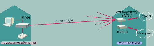 Невысокая цена и совместимость практически с любой телефонной линией сделали аналоговые модемы основным выбором индивидуальных пользователей. К сожалению, скорость передачи аналогового модема в значительной мере зависит от качества телефонной линии и установленного соединения. Именно поэтому получить максимальную скорость передачи данных практически невозможно (обычно модем с заявленной скоростью в 33,6 Кбит/с позволяет работать со скоростью 28,8 Кбит/с, в лучшем случае 31,2 Кбит/с). Непрофессиональные пользователи сети Интернет могут использовать и аналоговые модемы, но рано или поздно любой из них сталкивается с проблемами, связанными с низким качеством соединения и перегрузками телефонной сети общего пользования. Эта сеть, в своем существующем на данный момент виде, совершенно не предназначена для того, чтобы передавать трафик сети Интернет. Более высокоскоростной альтернативой аналоговым модемам служит ISDN (рисунок 7). ISDN (не совсем по-русски называемая цифровой сетью связи с интеграцией служб) представляет собой цифровую технологию, позволяющую передавать данные со скоростью 144 Кбит/с. Для этого используется схема кодирования 2В1Q. Скорость передачи данных 144 Кбит/с складывается из двух каналов В по 64 Кбит/с каждый, используемых для передачи голоса и данных, и одного служебного канала D 16 Кбит/с для передачи управляющих сигналов. Каналы В могут использоваться как два отдельных голосовых канала, два канала передачи данных со скоростью 64 Кбит/с, как два отдельных канала передачи голоса и данных, а также совместно для передачи данных со скоростью 128 Кбит/с.