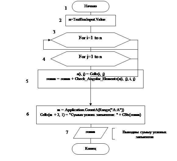 Блок 3-5 – цикл, в котором находится сумма угловых элементов;