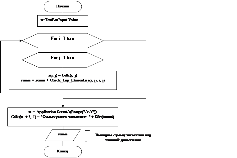 Блок 3-5 – цикл, в котором находится сумма элементов над главной диагональю;