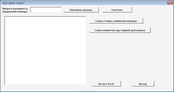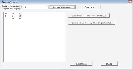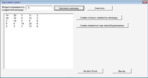 Согласно заданию был разработан программный модуль, осуществляющий заполнение матрицы А(n,n), которую задает пользователь, чтение заданной матрицы с листа Excel и подсчета суммы угловых элементов и элементов над верхней диагональю. При тестировании программ никаких отклонений не обнаружено: каждая функция корректно выполняет все операции. Таким образом, можно сделать вывод о том, что поставленная задача выполнена: на языке программирования Visual Basic for Application созданы программы, с помощью которых можно заполнить случайными числами квадратную матрицу размером n x n, найти сумму ее диагональных элементов и элементов над главной диагональю. В программе предусмотрена обработка ошибок, что обеспечивает бесперебойную работу программы.