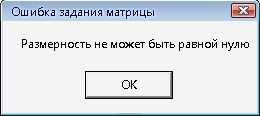 Если пользователь ввел размерность матрицы, равную нулю, либо не ввел данные (по умолчанию в VBA пустое значение автоматически приравнивается нулю), то выводится окно, представленное на рисунке 6.