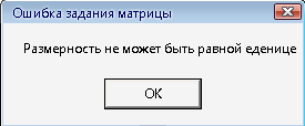 Если пользователь указал размерность матрицы равную единице, то, теоретически, это не является ошибкой, т.к. если исходить из определения, то любое действительное число – это матрица, размерностью 1*1. Но в условии данной задачи такая матрица не представляет интереса, поэтому рекомендуется поставить ограничение и на размерность равную единице. Выводимое окно представлено на рисунке 8.