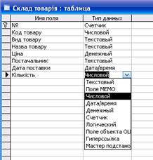 · в режимі конструктора потрібно задати імена полів та тип даних для них (рис. 2.1.5).