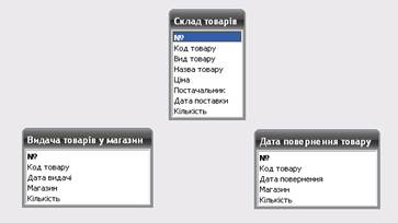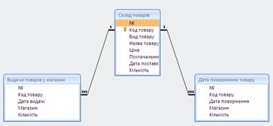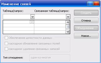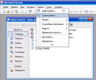 Для того щоб установити зв’язки в Ассеss потрібно натиснути сервіс-схема даних (рис. 2.5.1). В новому вікні будуть відображені всі таблиці створені в цій базі даних (рис. 2.5.2). Подвійним клацанням миші на вільному місці схеми викликається вікно створення зміни зв’язку (рис. 2.5.3).