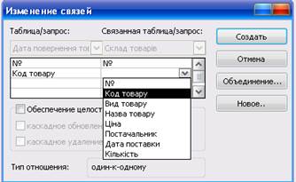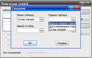 Натискаємо на кнопку нове в даному вікні, з’явиться вікно створення, в ньому вибираємо таблиці між якими потрібно установити зв’язок та поля за якими таблиці будуть зв’язані (рис. 2.5.4). Додаємо ще зв’язки якщо потрібно(рис. 2.5.5).