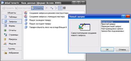 · переключити режим Ассеss на запити, натиснути кнопку створити, вибрати режим конструктора для створення запиту (рис 2.2.1).