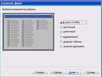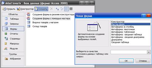 · переключити режим Ассеss на форми, натиснути кнопку створити, вибрати режим майстер форм для створення форми (рис 2.3.1).