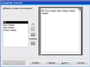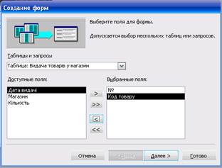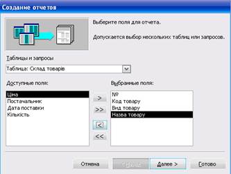 · вибрати таблицю з якої потрібно взяти дані, а потім вибрати поля, які потрібно виводити в звіті та натиснути далі(рис 2.4.2).